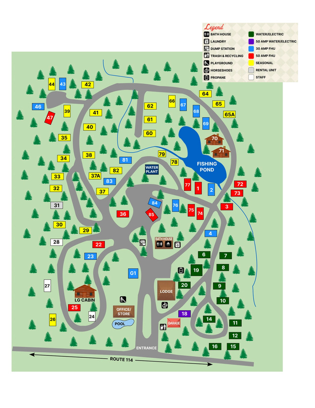Explore Family and Friends Campground via our detailed map, with numerous sites spread across several beautiful acres. Choose from comfortable cabins, full-hookup RV sites, or tent campsites all walking distance to our many on-site amenities.