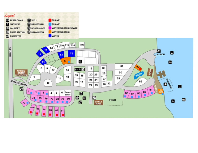 Explore Stetson Shores Campground with our detailed map, with numerous sites spread across several beautiful acres. Choose from full-hookup RV sites, water and electric sites or tent campsites, all walking distance to the lake and our many amenities.